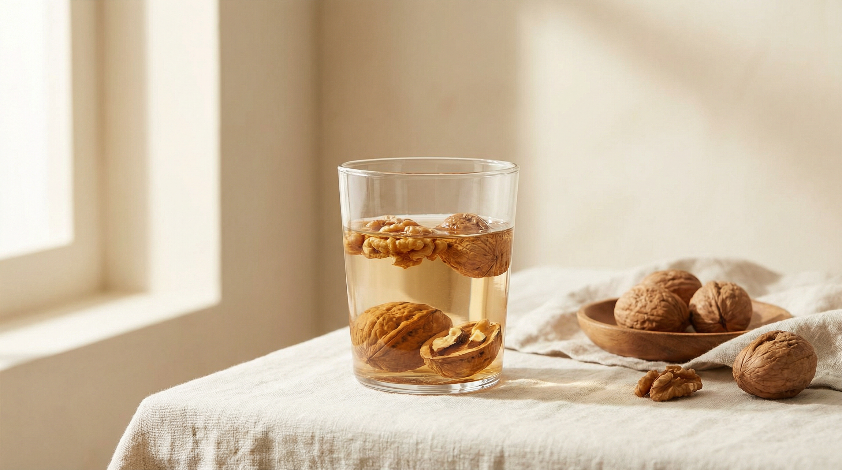 - Bardağın üzerini kapatıp geceden sabaha kadar bekletin. İdeal süre 8–10 saattir; bu sürede cevizin besin değerleri suya geçer.